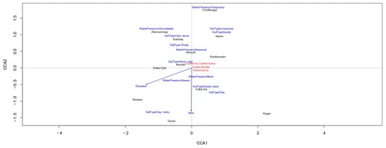 The first canonical axis (CCA1) explains most of the variation. It reflects the influence of environmental factors such as soil type, water availability, and anatomical traits, including epidermal thickness and conducting bundle area. The second axis (CCA2) highlights additional soil type and elevation differences. Populations such as Karasay and Samal are strongly associated with permanent water flows and clayey soils, indicating their adaptation to wetter conditions. In contrast, populations like Kendirli and Kogez are linked to seasonal water streams and rocky soils, suggesting their resilience to arid conditions. Populations on sandy and rocky soils, such as Botakan and Sultan Epe, exhibit weaker associations with anatomical parameters, likely due to the limited resource availability in these environments. Environmental factors such as range area and elevation moderately influence the distribution of anatomical traits. At the same time, soil type and water availability play a key role in the adaptive strategies of populations. These results emphasize the importance of ecological conditions in shaping the anatomical features of C. ambigua, providing insights into their adaptation to diverse habitats.