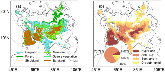 Spatial distribution of (a) land cover and (b) aridity classes in the Eurasian drylands.