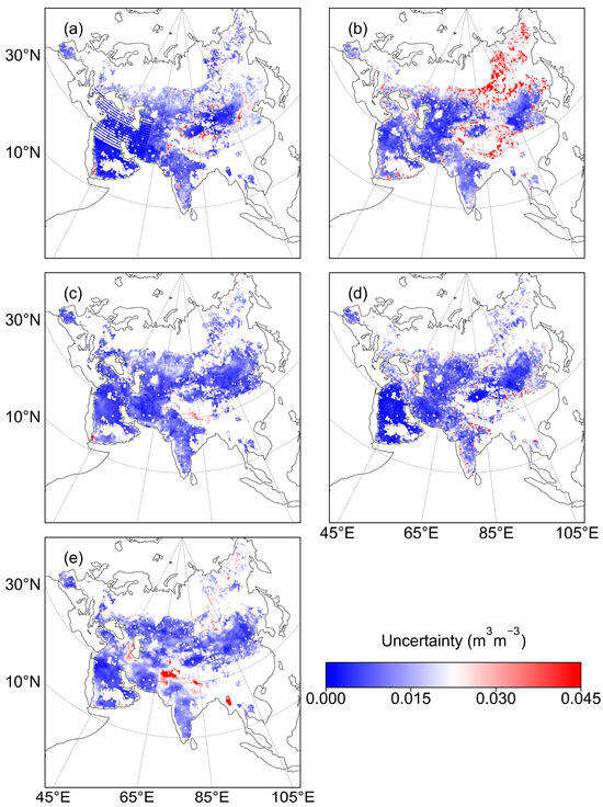 Uncertainty of the five SSM products ((a): ERA5, (b): ESACCI, (c): GLDAS, (d): GLEAM, (e): MERRA2) during the period of 1980–2023 quantified by the TCH method.