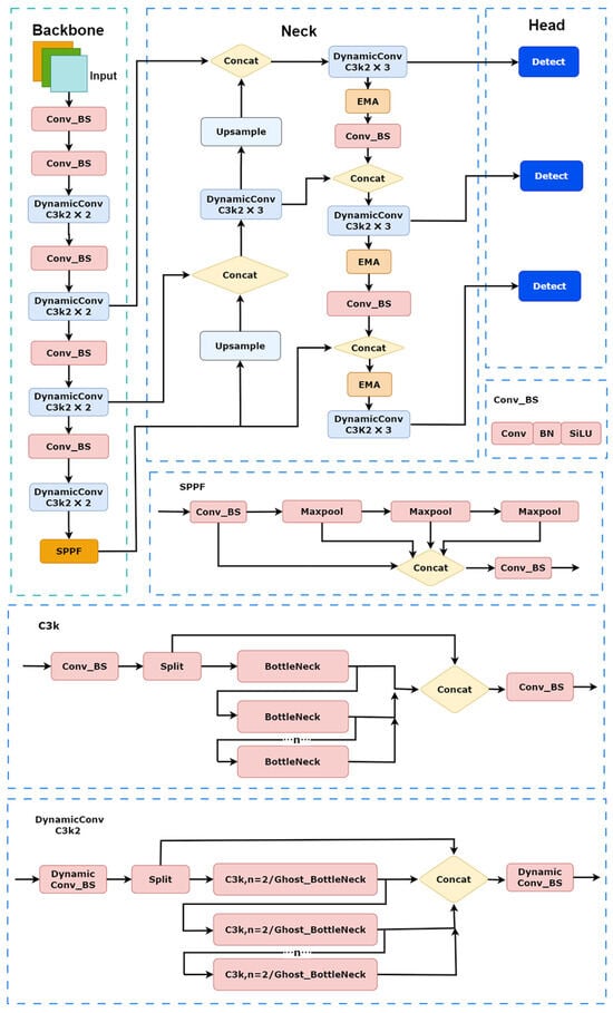 Figure 2, this study implements modifications by integrating dynamic convolution and an improved Ghost C3k2 module, accompanied by adjustment of the training weights for diverse feature representations. This study attempts to mitigate the loss of feature information in small objects during multiple sampling operations, thus introducing a DySample module to ensure robust detection performance for minute defects, such as mold spots and wormholes. These architectural refinements collectively enhance the network’s capability for precise localized detection tasks. In addition, an EMA module is inserted into the neck part to improve the ability to recognize detailed features.