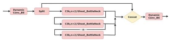 Figure 4, the improved C3k2 replaces traditional convolutions with DynamicConv, allowing C3k2 to obtain the dynamic weight advantage of DynamicConv in convolution calculations; it also uses GhostBottleneck to replace C3k2’s bottleneck, and Ghostbottleneck’s linear change method to reduce the number of convolution calculations.