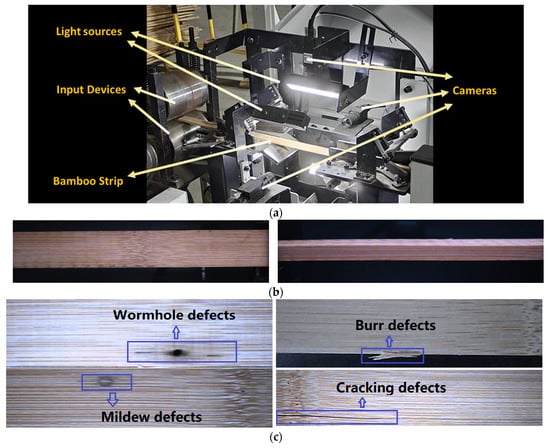 Figure 7a. The cameras are distributed on the front and side of the bamboo strip, and the light sources illuminate the sampling area. When the bamboo strips enter the sampling area, the cameras start capturing the images. The strip takes approximately 10 s to pass through the sampling area, during which time the cameras capture images and transmit them to a computer. During operation, the sampling platform is enclosed, free from external light interference. The camera aperture is set at F2.8, with an exposure time of 0.5 milliseconds. The light sources ensure sufficient exposure of the bamboo strip regions in the image, while the background remains very dark. The captured image is directly imported into the YOLO model for detection without additional photo processing.