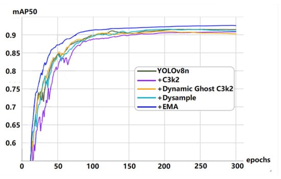 Figure 8 also shows the mAP curves after gradually adding modules, including the curve changes after adding C3k2, C3k2 improved by dynamic convolution, and the DySample module. These curves finally converge between 0.91 and 0.92.