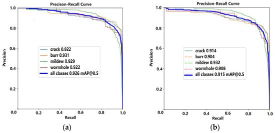 Taken together, through the research methods, the improved model in this study showed good performance in terms of the mAP and comprehensiveness of the burr and wormhole targets, indicating that the improved model had good target recognition ability for several samples.