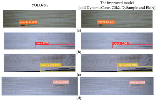 Table 3, we can see that the mAP of burrs and wormholes had better outcomes after the model was improved, and the detailed defect detection performance was significantly improved. The mAP of the base model (YOLOv8n) was 91.5%. With the dynamic convolution and improvement of C3k2, the mAP changed to 91.0%, the mAP of mildew decreased to 92%, and the mAP of wormholes decreased to 89.9%. After adding DySample, the defect detection increased by 1% for wormholes and by 0.5% for cracks, while that for burrs and mildew showed almost no change. In addition to EMA, the mAP of the improved model was 92.6%, the mAP of wormholes was 92.2%, and the mAP of burrs was 93.1%; indicators of other defects exhibited only slight changes. This observation indicates that the improved model dynamically adjusts the attention weights for different features, emphasizing wormholes and burrs more.