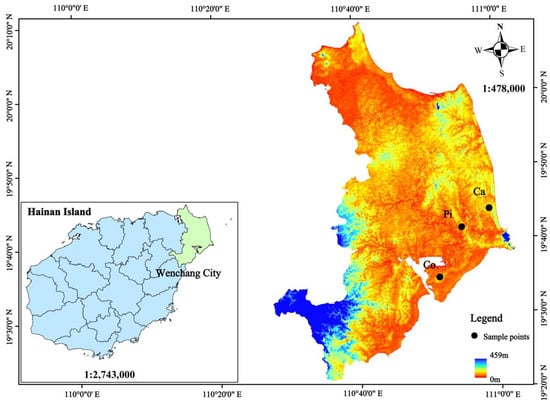 Schematic diagram of the study area and sample plot locations. Note: Ca, Co, and Pi are forests of Casuarina equisetifolia, Cocos nucifera, and Pinus elliottii × caribaea, respectively.