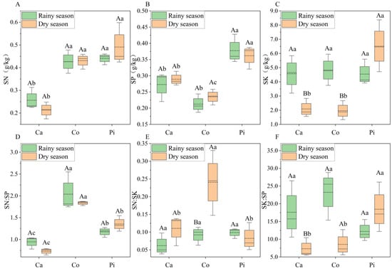 N, P, and K stoichiometric characteristics in soil of the three shelterbelt forests. Note: Ca represents Casuarina equisetifolia forests; Co represents Cocos nucifera forests; Pi represents Pinus elliottii × caribaea forests. Different uppercase letters indicate significant differences during different rainfall seasons (p < 0.05); different lowercase letters indicate significant differences in different forests (p < 0.05). SN, SP, and SK are N, P, and K contents in soil, respectively. (A–C) represent N, P, and K contents in soil of the three forests; (D–F) represent N:P, N:K, and K:P ratios of the three forests.