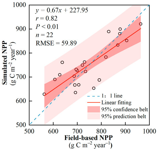 The comparison results between the simulated NPP and the measured NPP showed that the simulated NPP by the model and the measured NPP in the sample plots had a relatively high linear goodness of fit (r = 0.817, p < 0.01; Figure 2), indicating that this model can well simulate the NPP of subtropical forest vegetation.