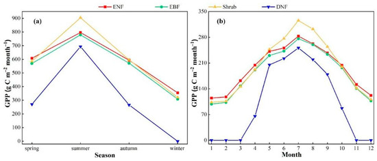 Multi-year average seasonal changes and multi-year average monthly variations in GPP for different vegetation types. (a) represents the variation of GPP with season; (b) represents the variation of GPP with month.