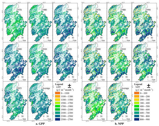 From 1970 to 2021, the interannual spatial distributions of the forest GPP and NPP in the Ganjiang River Basin are shown in Figure 6. During this period, the forest GPP showed an overall upward trend. It increased significantly from 1970 to 2000, with the areas with remarkable growth being in the upper reaches of the Ganjiang River. From 2000 to 2020, it showed a fluctuating trend, and the high-value areas in the upper reaches shifted to the middle and lower reaches. It decreased from 2000 to 2010 and then increased from 2010 to 2020, with the growing areas being in the middle reaches. The forest NPP also showed an overall upward trend. It increased significantly in the upper and middle reaches of the Ganjiang River from 1970 to 2000. From 2000 to 2020 it fluctuated, and the high-value areas shifted to the middle and lower reaches. It decreased from 2000 to 2010 and then increased from 2010 to 2020, with the growing areas being in the middle reaches.