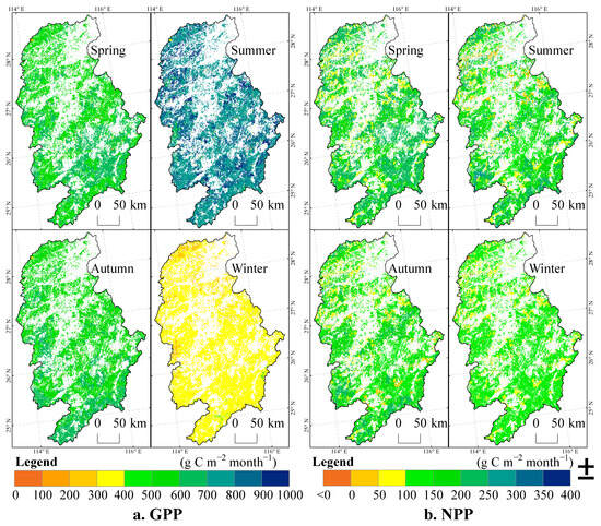 Spatio-temporal distributions of GPP and NPP of forests in the Ganjiang River Basin on the seasonal scale.
