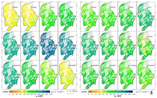 Spatio-temporal distributions of GPP and NPP of Forests in the Ganjiang River Basin on the inter-monthly scale.