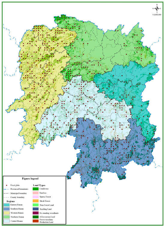 Our study targets ecological forests, which are forests that maintain ecosystem service functions situated in Hunan Province, China. These forests represent the most significant forest resource in Hunan, covering 36.65% of the total forest area, and are highly protected. The data used in this study are derived from monitoring data collected from 683 long-term fixed monitoring plots of 1000 m2 in the ecological forests range of Hunan Province (Figure 1, updated in 2019) [30]. These plots are evenly distributed across all counties and districts in Hunan Province (except for Furong District, Kaifu District, Shigu District, and Zhengxiang District, where no ecological forests are distributed). The plots cover various vegetation types, river basins, and ecological locations.
