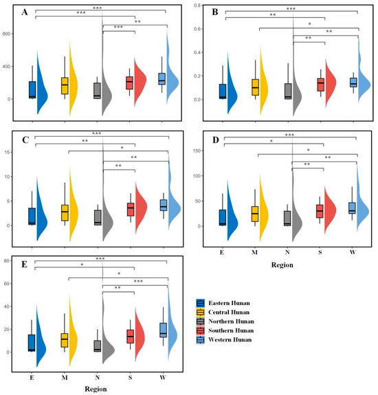 Comparison of ecological services across different regions. (A–E) represent soil conservation, forest nutrient retention, water source conservation, carbon sequestration and oxygen release, air purification. Asterisks (*, **, ***) represent p-values of 0.05, 0.01, and 0.001, respectively, indicating the significance of the differences between the regions.