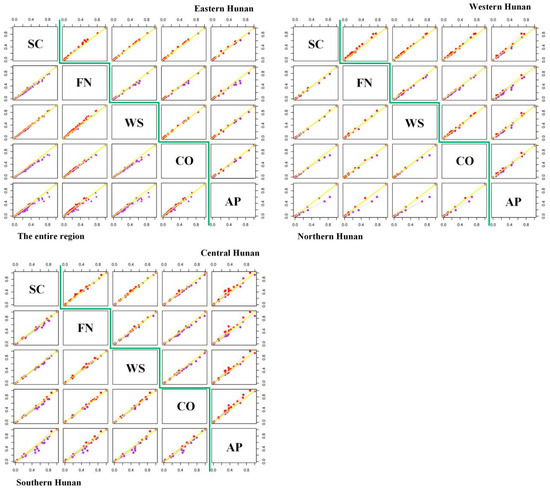 In the entire region, trade-offs were observed between soil conservation (SC)-forest nutrient retention (FN), water source conservation (WS)-carbon sequestration (CO), water source conservation (WS)-air purification (AP), SC-CO, SC-AP, FN-AP, and WS-AP. In Eastern Hunan and Western Hunan, the trade-offs between SC-FN and FN-AP pairs were observed. In Southern, Northern, and Central Hunan, the trade-offs between AP and others were observed.