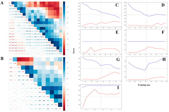 Correlation analysis of bioclimatic factors and learning curves of seven different machine learning algorithms. (A,B) Correlation matrices of 19 bioclimatic factors before (A) and after (B) removing highly correlated variables. Blue indicates positive correlation, red indicates negative correlation, with color intensity showing correlation strength. The blue line represents the training score and the red line represents the cross-validation score. (C–I) Represent Logistic Regression, k-Nearest Neighbors, Decision Tree, Random Forest, SVM, and LightGBM.