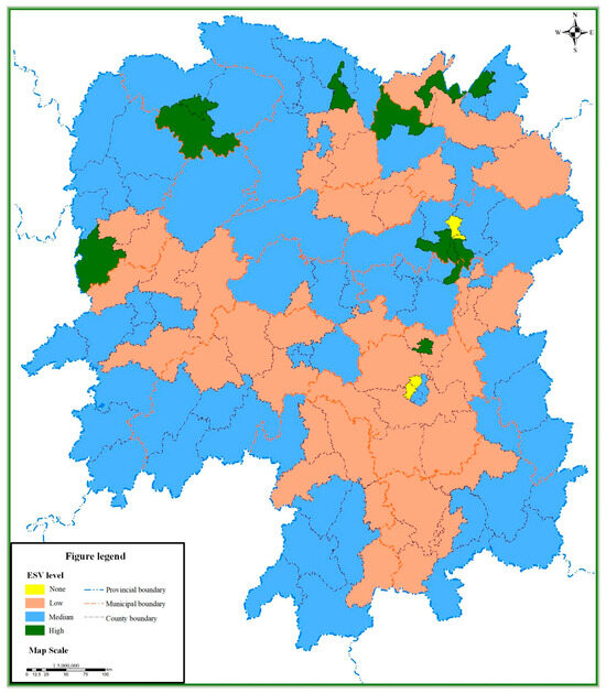 To further enhance the interpretability and practical applicability of our findings, we incorporated a spatial analysis using XGBoost. The selected features were interpolated onto a spatially uniform grid, allowing us to generate an ecological service map of the study area. This spatial visualization provides a more intuitive understanding of how ecological value is distributed across different regions, offering critical insights for regional ecological management and decision-making (Figure 5).