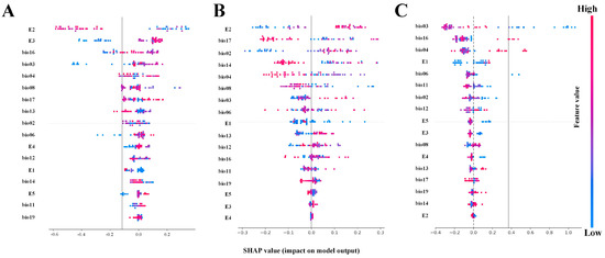 SHAP analysis results for the feature impact on model output. (A–C) SHAP values for the low, medium, and high category; the color intensity represents the feature value.