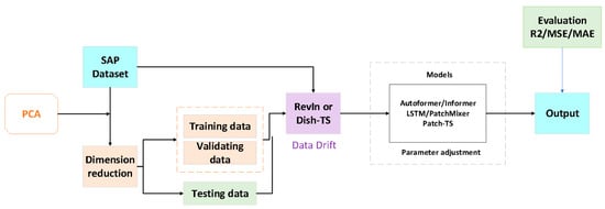 - In this paper, we introduce two normalization methods, RevIn (Reversible Instance Normalization) and Dish-TS, to address the problem of data drift. RevIn is a normalization method proposed by Kim [], which is specifically used for time series forecasting tasks. The core idea is to remove the mean and variance of the data at the model input stage and restore the original distribution of the data after the model forecast output. In this way, the distributional drift of the time series is reduced, allowing the model to focus on learning the patterns in the data rather than being affected by the overall size of the data. Dish-TS is a recently proposed time series normalization method that is mainly used for long-term time series forecasting []. Dish-TS mainly uses multiscale normalization to address features of different temporal granularity and de-trending in order to remove the long-term trend disturbances.