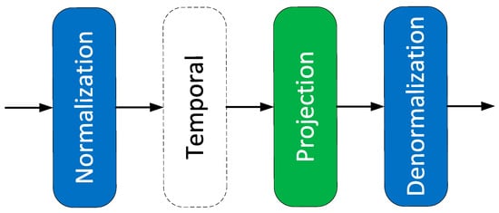 Figure 3. The general framework for time series forecasting comprises a reversible normalization layer, a temporal feature extractor, and a linear projection layer.- Data distribution drift mainly refers to the statistical properties of the time series, such as the mean variance, which changes over time. In the time series prediction task, the training set and the test set are often divided according to time, which naturally introduces the problem of inconsistency between the data distributions of the training set and the test set, which leads to inaccurate time series prediction. RevIn and Dish-TS is a data normalization method that can be easily applied to a variety of time series models and can be divided into two parts, normalization and denormalization, to solve data drift problems [].