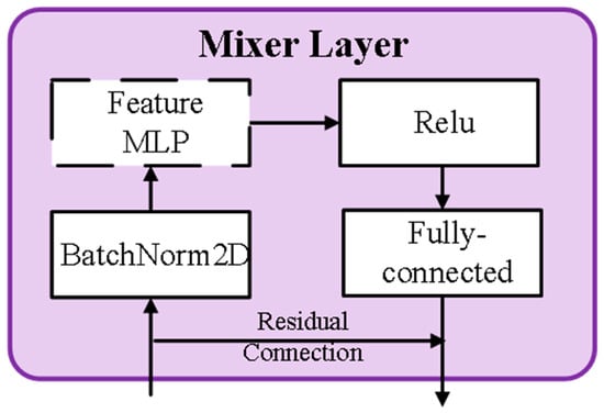 - Feature-mixing layer: The structure is shown in Figure 5, borrowed from the mixer layers in the TS-Mixer model, which can be divided into two main parts: time-mixing MLP and feature-mixing MLP. The MLP is applied alternately in the time and feature domains to better utilize the cross-variate information. To make the model more effective in learning the deep architecture, we also add residual connections to it. After repeated tests, we found that the time-mixing MLP does not perform well in predicting sap flow, so we discarded the time-mixing MLP and retained only the feature-mixing MLP.