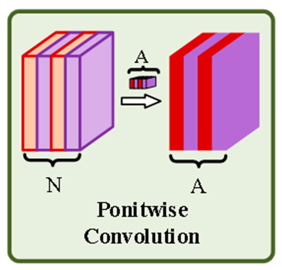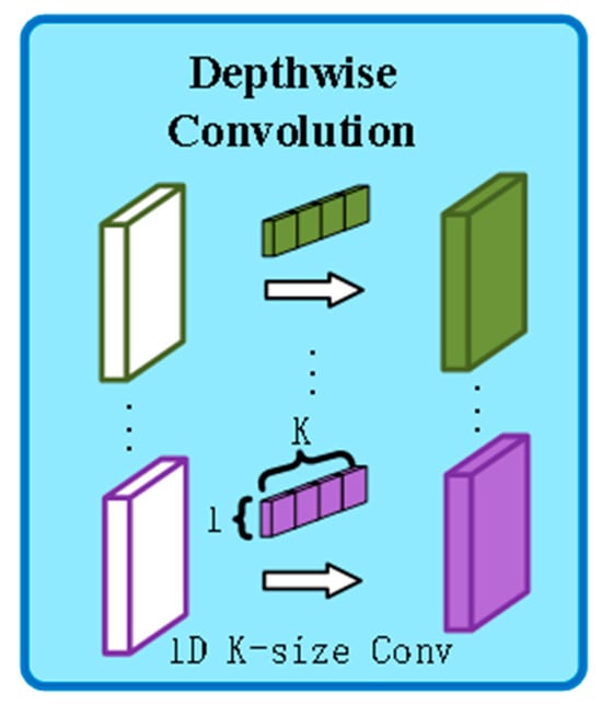 - Depthwise separable convolutional layer: In Figure 6, a specific type of grouped convolution is used in depthwise convolution, where the number of groups is equal to the number of patches, denoted as N. In order to expand the receptive domain, we use a larger kernel size equal to the default patch step S, so K = 8. In this process, each of the N patches in the input feature maps are individually convolved. This operation generates N feature maps, each corresponding to a specific patch. These feature maps are then sequentially concatenated to obtain an output feature map with N channels. Depthwise convolution effectively uses group convolution kernels that are identical for patches sharing the same spatial location. This allows the model to capture potential periodic patterns in the patches.