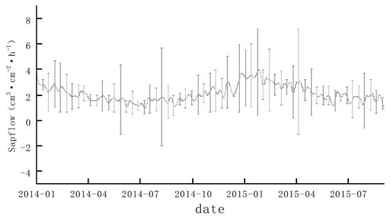 As shown in Figure 8, the sap flow exhibited a cyclic variation, with a slow downward trend from January to July 2014, a gradual increase from August to December, and a similar slow downward trend from January to July 2015.