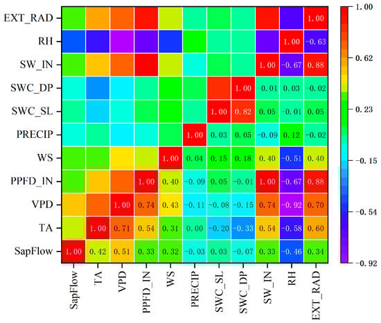 Correlation analysis: After the data were preprocessed, the correlations between sap flow and the environmental factors were analysed mainly via the Pearson correlation coefficient method. It is a statistic used to measure the degree of linear correlation between two variables X and Y. It is a measure of the degree of linear correlation between two variables []. In practice, the Pearson correlation coefficient is widely used in scientific research, data analysis, and machine learning to quantify the strength and direction of the linear relationship between two variables. On the basis of the results of the analysis, a heatmap is drawn, as shown in Figure 9 below, and the results reveal that sap flow is positively correlated with Ta (air temperature), VPD (vapour pressure deficit), PPFD_IN (photosynthetic photon flux density), SW_IN (shortwave incoming radiation), EXT_RAD (extraterrestrial radiation), and WS (wind speed) and negatively correlated with RH (relative humidity) and that the correlations with PRECIP (precipitation), SWC_SL (the shallow soil water content), and SWC_DP (the deep soil water content) are not significant.