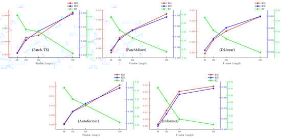 As shown in Figure 10, the performance of the models is affected by the length of the prediction window regardless of whether the model used is changed or not. At a prediction window length of 96, the performance of all models is better, and as the prediction window length increases to 720, the error of all models increases and R2 decreases, that is to say, the longer the prediction window is, the performance of the sap flow prediction models gradually becomes worse, which is due to the fact that the longer the prediction window is, the weaker the correlation between the environmental data of the historical information at the initial moment and the sap flow, and it is difficult for the models to extract the effective features. Furthermore, although the problem of data drift is mitigated by the normalization method, the impact of the problem also remains, especially in long-term prediction. In addition, since long-term prediction requires the model to infer complex laws from limited laws, it is easy to lead to overfitting problems.
