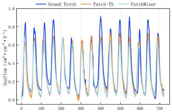 Comparison of sap flow measurements with PatchMixer and Patch-TS predictions for a prediction window = 720.