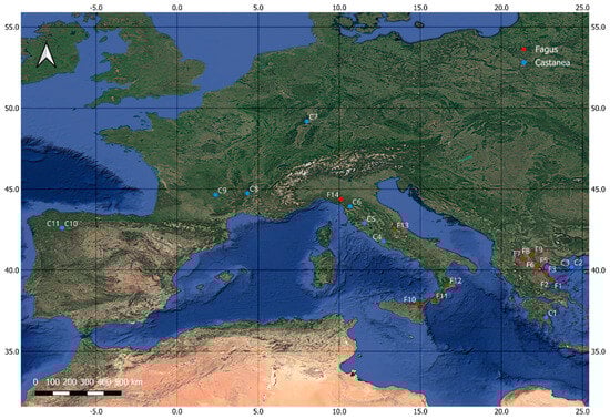 Two ecosystem types dominated by the deciduous Fagus sylvatica and Castanea sativa were studied for a 23-year period across Europe. These two species were chosen because they are deciduous (the phenology of which is easier to monitor) with wide expansion in Europe and form homogenous stands allowing the implementation of RS techniques. Moreover, these species have great socioeconomic value (e.g., food, wood, and medicine) and are of large ecological significance. The study sites for each species were determined by using the database of the European Forest Genetic Resources Programme (EUFORGEN, https://www.euforgen.org/, accessed on 15 January 2024). A total of 14 and 11 sites were selected for Fagus sylvatica and Castanea sativa, respectively, as shown in Figure 1 and Table 1. All sites were checked to ensure that they are homogenous and dense for an area expanding over a MODIS 500 m pixel to avoid any “contamination” from image processing. The latitude of Fagus sylvatica sites ranges between 37.92° and 44.38° and altitude between 882 and 1526 m a.s.l., while the latitude for Castanea sativa ranges between 37.09° and 49.18° and altitude between 360 m and 1111 m a.s.l.
