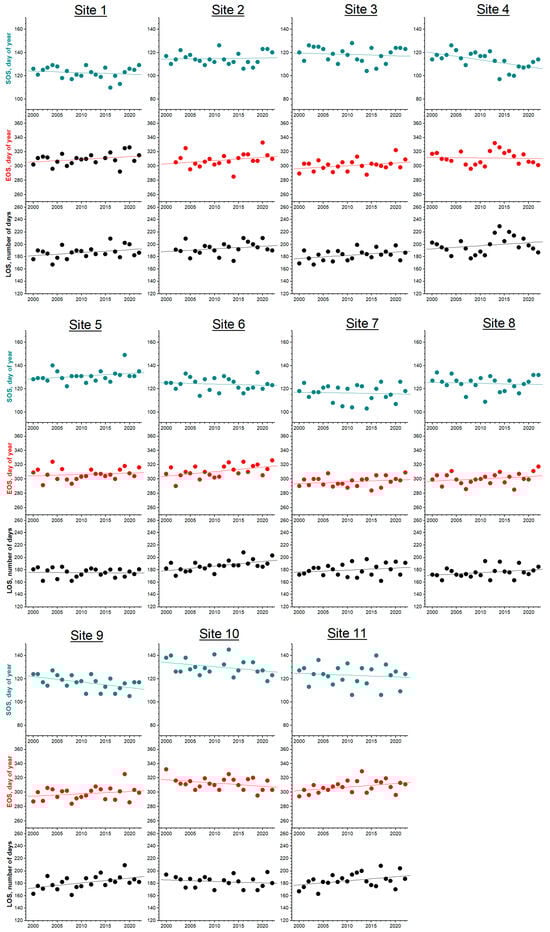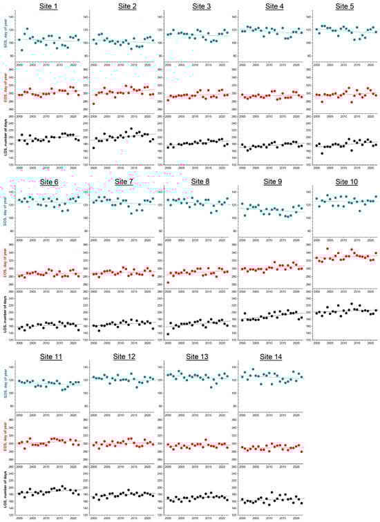 The present study focuses on the three basic phenological events, the Start Of Season (SOS, date), End Of Season (EOS, date), and Length Of Season (LOS, number of days). Several methods exist in the relevant literature for the determination of the SOS and EOS in deciduous ecosystems, with each one having their pros and cons. For the purposes of this study, the relative SOS and EOS dates are estimated based on the amplitude threshold method [], as follows. First, the NDVI timeseries were smoothed using the Savitzky–Golay filter, and after that they were transformed to daily NDVI using a linear interpolation technique. From the daily NDVI timeseries for the 23 years of the analysis, an average annual timeseries was produced, from which the minimum and maximum NDVI values for each site were estimated. Based on those values, a specific NDVI threshold was estimated for each site as the value halfway between the two of them. Finaly, using the NDVI threshold of each site, the SOS and EOS dates of each year were calculated from the whole NDVI timeseries. Accordingly, the (relative) LOS was calculated as the number of days between the EOS and SOS.