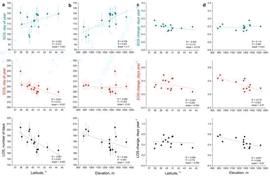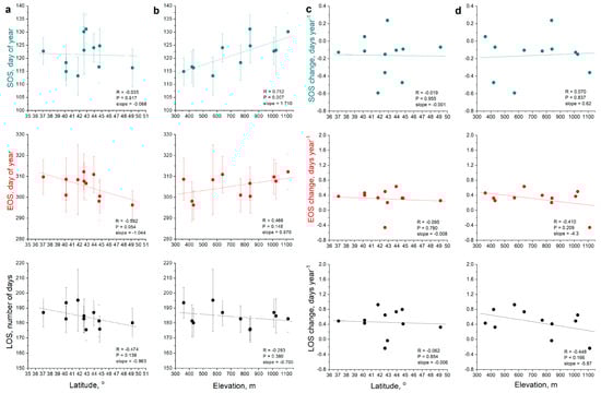 Accordingly, the interannual fluctuation of SOS, EOS, and LOS and their corresponding statistics for the Castanea sativa sites are presented in Figure 4 and Table 3. Similar to Fagus, sites of Castanea show the same trends (not significant in most cases at p ≤ 0.05 level) for earlier spring green-up, later autumn senescence, and elongation of the growing period. Moreover, Castanea also shows the same spatial patterns as Fagus, with sites on higher latitudes and higher altitudes having shorter growing periods. However, none of these patterns are statistically significant. The latitudinal pattern is caused by the earlier EOS of sites on higher latitudes (R = −0.592, p = 0.054), while no trend appears for SOS (Figure 5a). On the other hand, shorter LOS of high-altitude sites is caused by a significant later spring green-up (R = 0.752, p = 0.007), which is partly counteracted by a non-significant trend for a later EOS (Figure 5b). Concerning the interannual change of the phenological parameters, LOS change is more intense at the lower altitude sites due to corresponding more intense changes in EOS (Figure 5d), as was the case also for Fagus, although none of these trends are statistically significant. Finally, no latitudinal patterns are observed for Castanea metrics’ change over the years (Figure 5c).