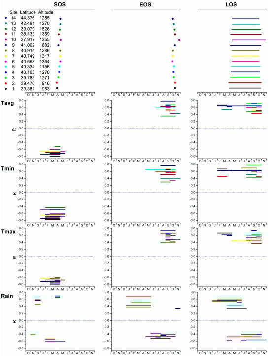 The phenological parameters and their relationships with meteorological parameters (minimum, maximum, average monthly temperature, and total monthly precipitation) for the Castanea sativa sites. On the top panels, the dates for the phenological parameters (SOS, EOS, and LOS) are shown as dots with different colors for each site (data from Table 3). On the lower panels, the R values (y-axis) for the time interval with the highest correlation between each phenological and climatic parameter are shown as dashes for each site. The different lengths of dashes correspond to means/sums of meteorological data for different time intervals (x-axis).