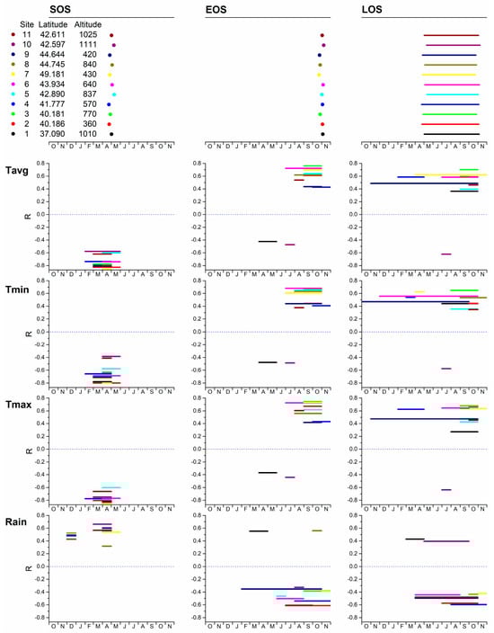 The phenological parameters and their relationships with meteorological parameters (minimum, maximum, average monthly temperature, and total monthly precipitation) for the Fagus sylvatica sites. On the top panels, the dates for the phenological parameters (SOS, EOS, and LOS) are shown as dots with different colors for each site (data from Table 2). On the lower panels, the R values (y-axis) for the time interval with the highest correlation between each phenological and climatic parameter are shown as dashes for each site. The different lengths of dashes correspond to means/sums of meteorological data for different time intervals (x-axis).