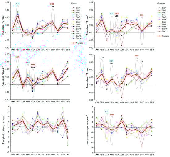 Monthly change trends of the meteorological variables (Tmin, Tmax, and precipitation) for each site of the two studied species and their average for all sites of each species (slopes of parameters’ linear regression in time) during the study period (2000–2022). For each species, the most important variables affecting the phenological parameters are indicated in ellipses, and the corresponding phenological parameter is indicated above each ellipse (Table 4).