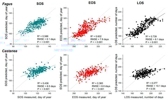 Measured (MODIS derived) vs. predicted phenological parameters (SOS, EOS, and LOS) for the two studied species, as modeled by the multiple linear regression analysis (Table 4).