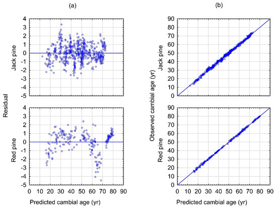 Species-specific cambial age prediction model (Equation (3)) residual plots: (a) raw residual–predicted value scatterplots; and (b) observed—predicted value scatterplots where the solid diagonal line denotes equivalency.