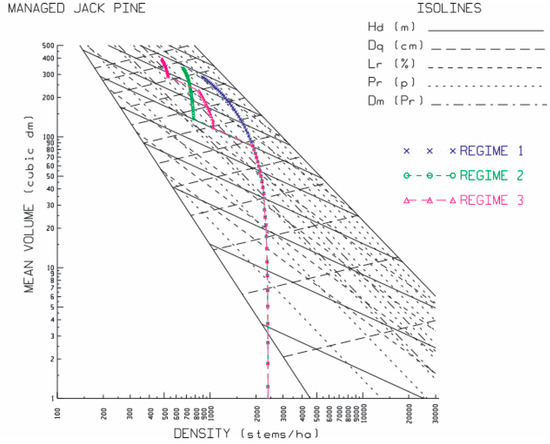 Temporal size–density trajectories for the three jack pine plantations growing under conditions consistent with a RCP4.5 climate change scenario on medium-to-good site qualities (SI = 18) situated in Northeastern Ontario (Kirkland Lake) as illustrated within the context of the traditional stand density management diagram (SDMD). Specifically, Regime 1 represented a crop plan that included a single initial espacement treatment consisting of the planting of 2400 genetically enhanced seedlings per hectare at an inter-tree spacing of 2.0 m × 2.0 m with no subsequent thinning treatments; Regime 2 represented a crop plan which included the identical initial espacement treatment as Regime 1 but in addition included a single heavy commercial thinning (CT) treatment at age 30 during which 35% of the basal area was removed; and Regime 3 represented a crop plan that likewise consisted of the identical initial espacement treatment as Regime 1 but also included two moderate CT treatments occurring at ages 30 and 45 during which 25% and 20% of the basal area was removed, respectively. Note, the SDMD graphically illustrates the following density-dependent relationships: (1) isolines for mean dominant height (Hd; parallel negative sloping solid lines progressing upwards from 4 m to 22 m by 2 m increments), quadratic mean diameter (Dq; parallel positive sloping dash lines progressing upwards from 4 cm to 26 cm by 2 cm increments), mean live crown ratio (Lr; parallel diagonal dashed lines demarking the 35% (outer-most), 40%, 50%, …, 80% (inner-most) values), relative density index (Pr; parallel diagonal short dashed lines progressing from 0.1 (inner-most) to 0.9 (outer-most) by 0.1 increments); (2) crown closure line (inner-most solid diagonal line); and self-thinning rule at a Pr = 1.0 (outer-most solid diagonal line); (3) lower and upper Pr isolines delineating the optimal density management window (Dm (0.32 ≤ Pr ≤ 0.45; pair of parallel diagonal short–long dashed lines); and (4) forecasted 65 year (2024–2089) size–density trajectories with 1 year intervals denoted for each regime. Refer to Table 1 for more detailed crop plan specifics.