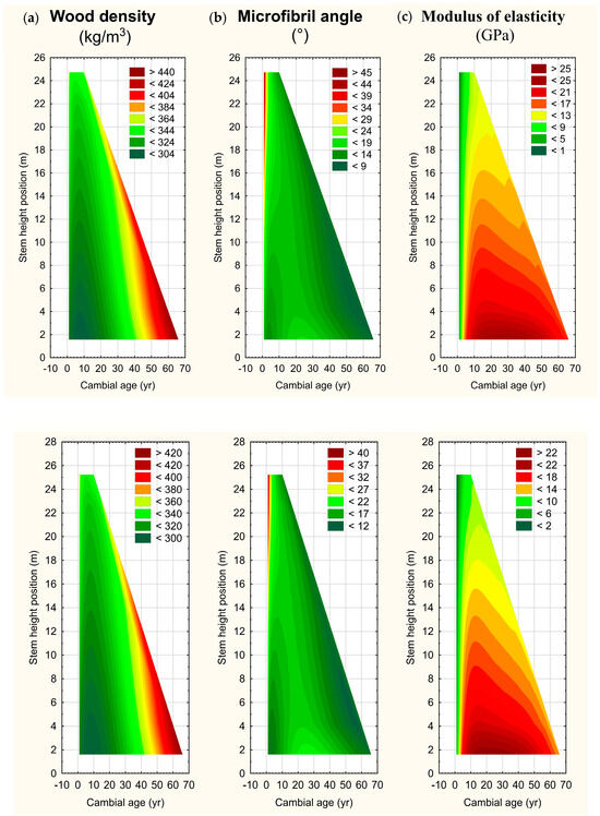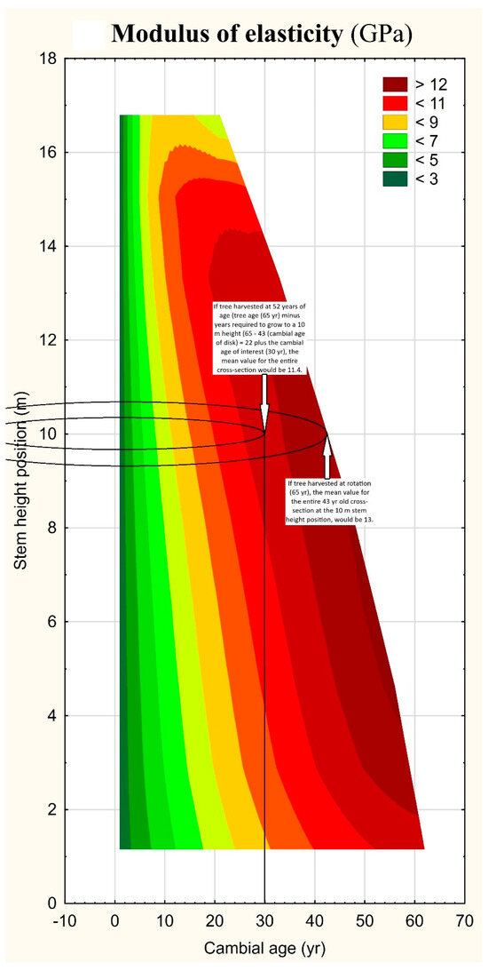 Likewise, for the exemplified mature sawlog-sized red pine trees, the retrospective cumulative developmental trajectories for wood density (Figure 8) exhibited a nonlinear-like horizontal pattern where values exhibit a gradual then rapid temporal increase particularly within the lower bole region. Conversely, a relatively constant oblique trend was evident in which values for any given age remained relatively constant with increasing stem height. Although the microfibril angle was relatively age invariant irrespective of height position, the values did minimize during the period following juvenile wood formation (≈20 yrs; Figure 8). The temporal horizontal and height-dependent oblique trends observed for the modulus of elasticity contrasted to that observed for jack pine (c.f., Figure 7 versus Figure 8). Specifically, in red pine, radial values maximized within the lowest stem regions and temporally before maturity was reached (i.e., unique lower-bole (<12 m) increasing concentration of high wood stiffness values with decreasing height across a wide developmental range (5–65 yr cambial age range)). Collectively, these trends suggest that lumber-producing potential within these mature sawlog-sized red pine trees was maximized within the lower central region of the stem.