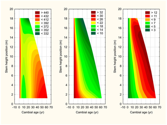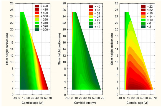 Innovative advancements in attribute determination methods inclusive of X-ray densitometry, Silviscan, and near-infrared spectroscopy have set the stage for advanced within-stem attribute mapping (e.g., descriptive graphical interpolation methods [47,48,49,50,51]) and model development (e.g., empirical prediction modelling [52,53]). In reference to the graphical approaches, Defo [47] developed a triangular-based whole-stem mapping algorithm for graphically presenting Silviscan-derived individual annual ring attribute estimates for destructively sampled trees (EvaluTreeMap). They demonstrated the utility of the approach by contrasting the fibre coarseness profiles and associated descriptive statistical metrics between diseased (Armillaria ostoyae) and disease-free interior Douglas fir (Pseudotsuga menziesii (Mirb.) var. glauca (Bessin.) Franco) trees. Schimleck [48] deployed an Akima-based interpolation approach to formulate whole-stem property maps for wood density, microfibril angle, and modulus of elasticity within loblolly pine (Pinus taeda L.) trees. They subsequently investigated the effect of plantation age on these distributions within the context of end-product potential. Additional property maps and associated inferences were similarly presented by Schimleck [54] for other commercially relevant fibre attributes (e.g., fibre coarseness, tracheid wall thickness, radial and tangential diameters, and specific surface area).