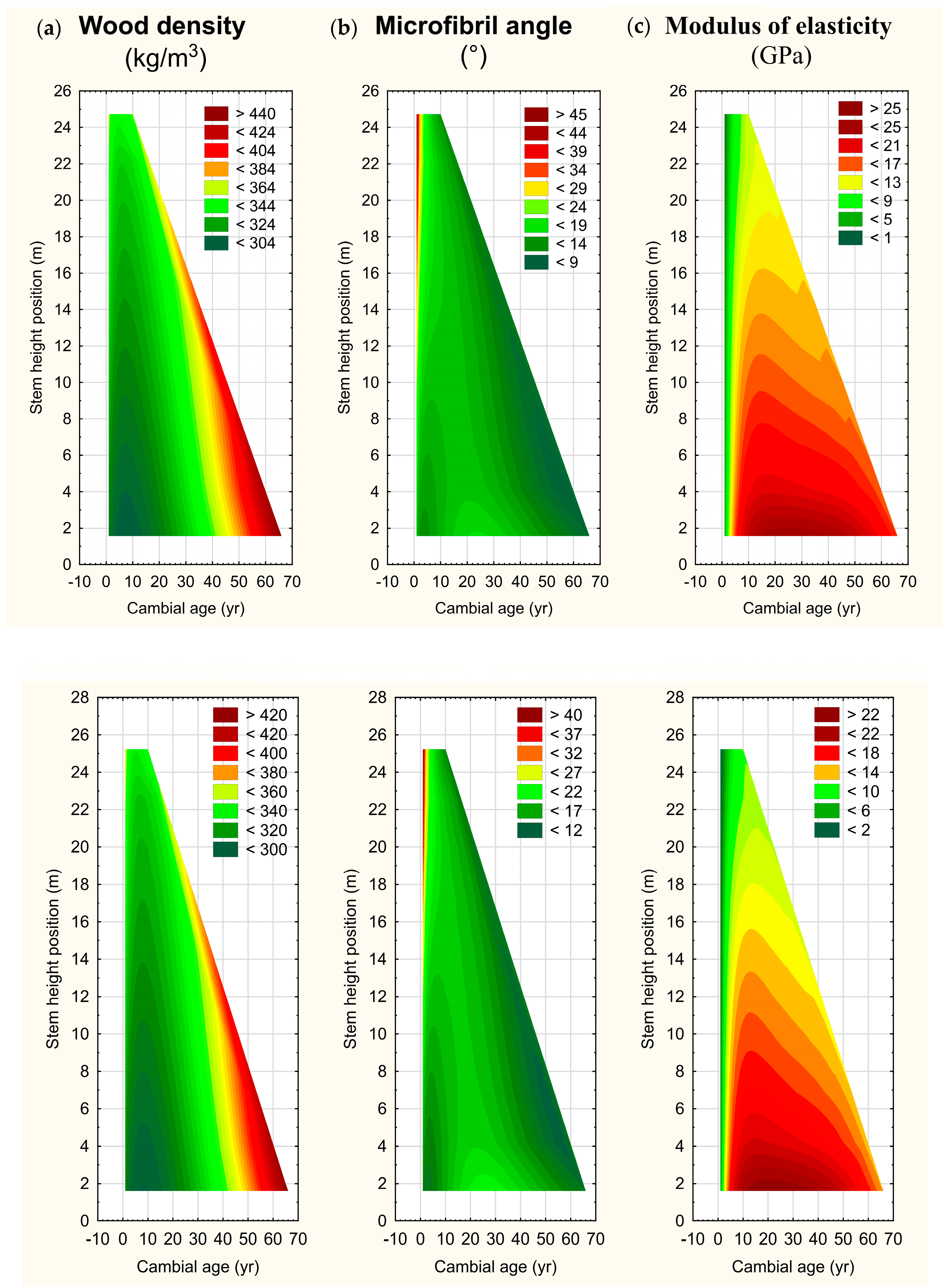 where V ( i j k ) ( l ) is the cumulative annual ring-area-weighted moving average value up to the ith cambial age (i = 1, …, I; I = cross-sectional total cambial age) specific to the jth cross-sectional disc, kth sample tree, and lth attribute; v ( i j k ) ( l ) is the mean area-weighed attribute value for the annual ring produced in the ith cambial year specific to the jth cross-sectional disc, kth sample tree, and lth attribute; and a i j k is the area (mm2) of the annual ring produced in the ith cambial year specific to the jth cross-sectional disc and kth sample tree. The 2nd-level equations expressed the parameters of the first-level equations as functions of cross-sectional-based covariates (i.e., cross-sectional age, diameter, and stem height position) while the 3rd-level equations expressed the 2nd-level equation intercept terms as functions of a tree-level size covariate (i.e., cumulative breast-height diameter reflective of the acknowledged size dependency effect [5]). The sequential incorporation of these three hierarchical-level models into a composite specification and its subsequent iterative-based parameterization for each attribute and species yielded the equation suites. Overall, the jack pine prediction equations explained 46, 66, 74, 63, 59, 72, 42, and 48% of the variation in Wd, Ma, Me, Co, Wt, Dr, Dt, and Sa, respectively, as measured by the index of fit statistic (Table 2 in [7]). Prediction errors as quantified by positional-based 95% tolerance intervals [16,17] revealed that 95% of future relative errors across all stem height positions would be expected to vary from a minimum of ±11% to a maximum of ±14% for Wd predictions, and likewise ±35% to ±49% for Ma, ±28% to ±65% for Me, ±14% to ±16% for Co, ±13% to ±19% for Wt, ±8% to ±11% for Dr, ±6% to ±7% for Dt, and ±11% to ±14% for Sa (Table 4 in [7]). Similarly, the red pine equations explained 50, 71, 31, 83, 72, 78, 56, and 71% of the variation in Wd, Ma, Me, Co, Wt, Dr, Dt, and Sa, respectively (Table 3 in [7]). Similarly, the 95% of future relative prediction errors would be expected to vary from a minimum of ±8% and a maximum of ±10% for Wd predictions, and likewise ±26% to ±39% for Ma, ±26% to ±64% for Me, ±9% to ±16% for Co, ±9% to ±14% for Wt, ±6% to ±11% for Dr, ±4% to ±8% for Dt, and ±8% to ±14% for Sa (Table 5 in [7]). Based on an assessment of an array of goodness-of-fit, lack-of-fit, and predictive performance metrics for each attribute of both species, it was collectively inferred that the equations were correctly specified and yielded relatively precise and unbiased fibre attribute estimates throughout the entire stem of both species. A complete account of the analytics deployed, inclusive of attribute-specific equation specifications, parameterization, and validation methods and resultant parameter estimates and predictive performance metrics, can be found in [7].