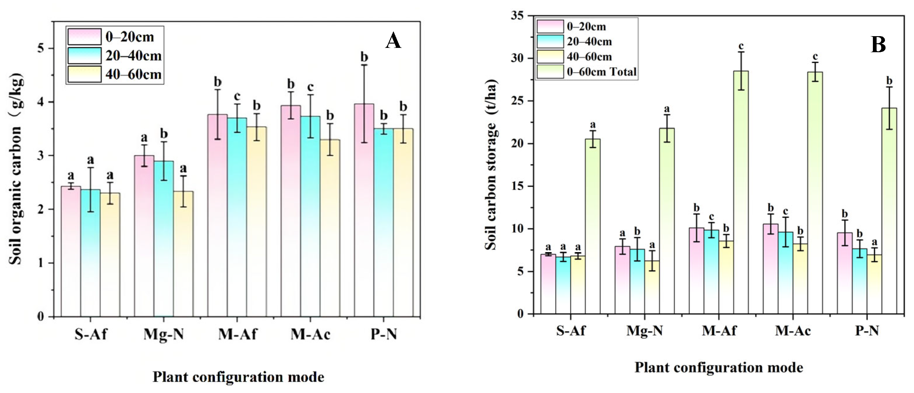 SOC (A) and SCS (B) distribution of 5 plant configuration modes. Different small letters indicate significant difference (p < 0.05).
