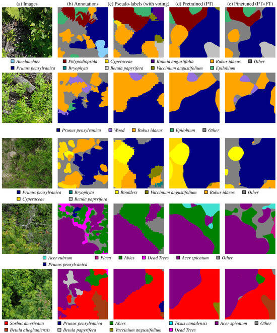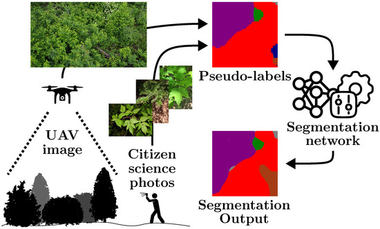 Pseudo-labeling for semantic segmentation has been explored for various applications, including surface crack segmentation [26,27], but far less with UAVs in forestry. One such example is the very recent work of Soltani et al. [9], where they used pseudo-masks over ten species to train a CNN-based segmentation model on an experimental forest plantation [28]. These pseudo-masks were generated by a classifier trained on iNaturalist [24] and Pl@ntNet [22,23], using the moving-window approach introduced by Soltani et al. [8]. They noted that the trained segmentation model had a higher score compared to the pseudo-masks, highlighting the resilience of neural networks to label noise during training [29].