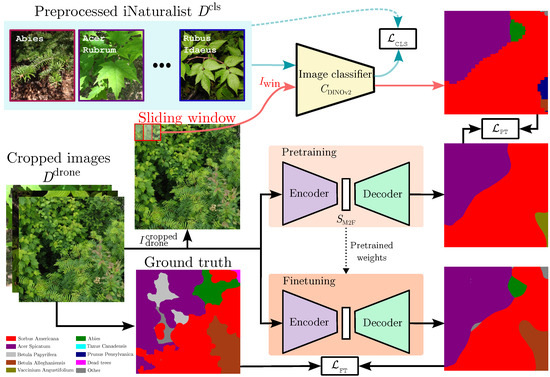 In this study, we address the challenge of training a semantic segmentation network, (based on the Mask2Former architecture [30]), for the target environment of natural regeneration zones, for which there are little-to-no labeled UAV images. The first step was to create a large dataset of UAV images taken over these natural regeneration areas in many distant regions of the Canadian province of Quebec. Importantly, we collected this dataset with the unique particularity that it would exhibit a very small GSD, between 0.8 and . In parallel, we trained a classification network on a dataset comprising numerous images from iNaturalist, tailored for our target species. Applying this classifier in a moving-window manner on our collected UAV images, we generated pre-training pseudo-labels for the semantic segmentation network . We also performed training experiments on with a few annotated UAV images, both before and after pre-training on our pseudo-labels. Overall, this process is depicted in Figure 2.