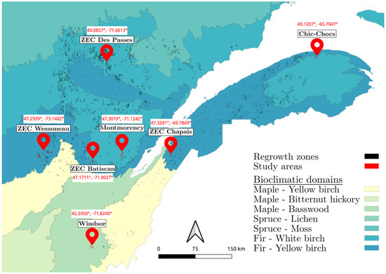 This study was centered on regeneration zones across the province of Quebec, Canada. Specifically, we focused on forest areas that were logged between 2018 and 2022, where vegetation had been growing for two to six years. Figure 3 depicts a map of the southern region of the province of Quebec, where the polygons (black specks) represent regeneration zones, according to geospatial data from the Quebec open data portal [31]. Based on the extracted regeneration polygons, we collected UAV data in seven study sites accross the province, namely ZEC Batiscan (47.1711°, −71.9027°), ZEC Chapais (47.3291°, −69.7849°), Chic-Chocs (49.1207°, −65.7047°), ZEC Des Passes (49.0857°, −71.6613°), Montmorency (47.3019°, −71.1242°), ZEC Wessoneau (47.2939°, −73.1482°), and Windsor (45.5950°, −71.8240°), all shown in Figure 3. They were chosen in a way that ensures the diversity and availability of all target species in our dataset. They also make the segmentation problem much harder compared to using a single site [9], thus are closer to real deployment conditions. The summary of the study sites, presented in Table 1, shows that they are located in three bioclimatic domains of the province of Quebec [32]: