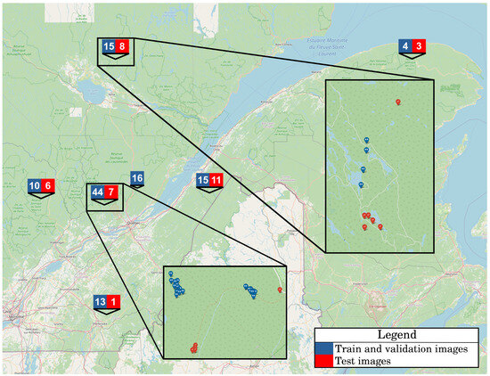 Acquisition location of the train, validation, and test images. The number of images per site is displayed in white text, with a blue background representing the train/validation set and a red background for the test set. The insets show that, for a single study site, the images in the train and validation sets were acquired in different locations than the test images. This clear spatial separation ensures that the model’s generalization capabilities can be properly evaluated.