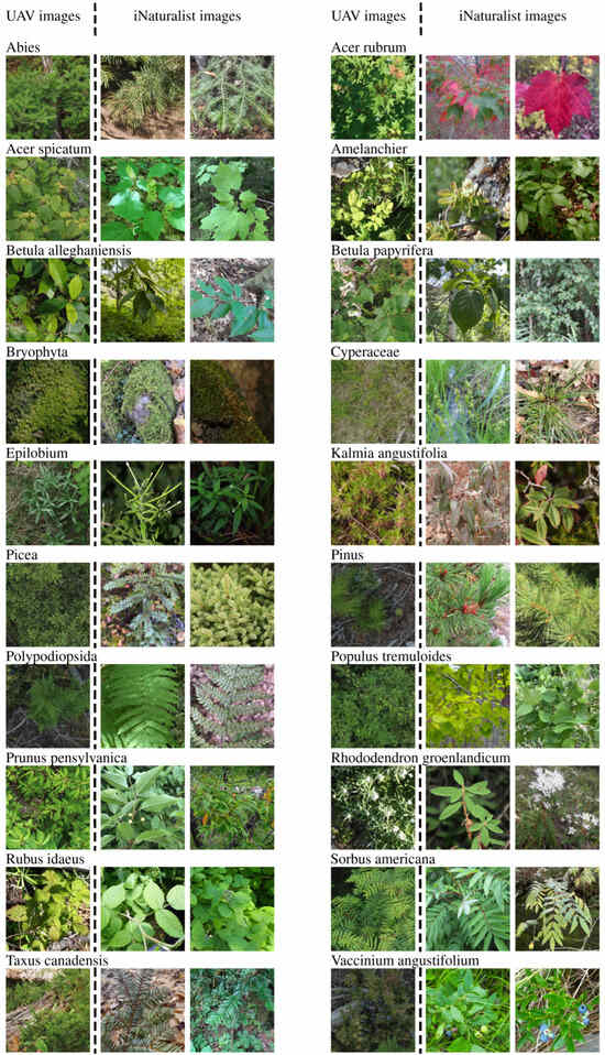 Biases in Citizen Science-Based Datasets—Datasets from citizen science initiatives are inherently biased. For instance, most photos were taken at ground level. This implies that canopies were observed from the bottom, and photos of small plants tend to be very close. Also, there may be a lack of photos of species that are not common in populated areas [46], which could be our situation in post-disturbance zones. Finally, citizen science datasets tend to be biased toward key traits of a species: yellow birch, known for its distinctive bark, is often identified by photos of its trunk rather than by its leaves. This domain gap between citizen science data and UAV images motivated the use of data augmentation and dataset filtering [47].