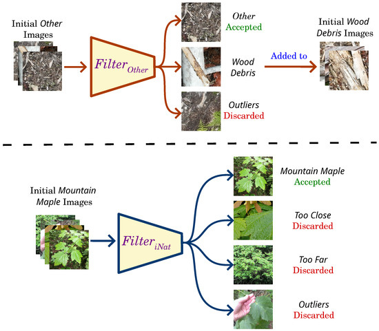 Classifiers used for filtering. The top classifier was used to filter Other images and remove Outliers and move Wood Debis to the correct class, as the bottom classifier was used to filter iNaturalist plant images by removing Outliers, Too close, or Too far images.