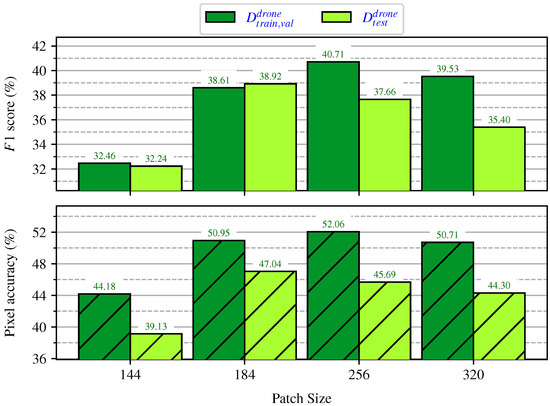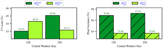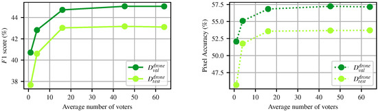 Collecting predictions for slightly different views is a form of test time augmentation known to increase accuracy [41]. Here, we investigate the impact of using more than one prediction per UAV image pixel, using a majority vote. For this experiment, the size of and was set to 256 × 256 pixels. We slid the window by 256, 128, 64, 38 (overlap = ), and 32 to gradually increase the number of votes per pixel, as seen in Figure 10. For instance, by sliding by 256 pixels, we only obtain one projected prediction per pixel in , as the pseudo-label generation process of the study by Soltani et al. [8,9]. As expected, we can see that increasing the number of votes per pixel generally increases the score. In particular, employing 64 votes increases it by 4 , which is a significant improvement. As it exhibited the best results, we selected a pixel stride of 38, resulting in an average of 45.38 votes per pixel.